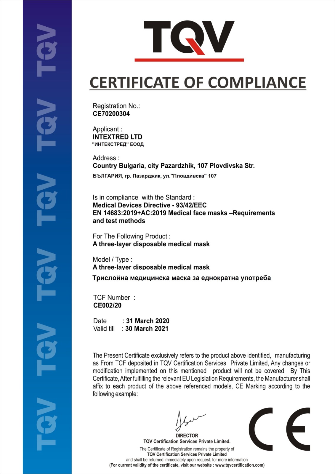 A bolgár Intextred nevű cég eldobható 3 rétegű orvosi maszkokat gyárt (EN14683: 2019 + AC2019 - TYPE IIR, ár: 0,15 EUR/db Áfával), és termékei értékesítéséhez keres magyarországi partnereket, további információ a mellékletben és a cég honlapján érhető el.